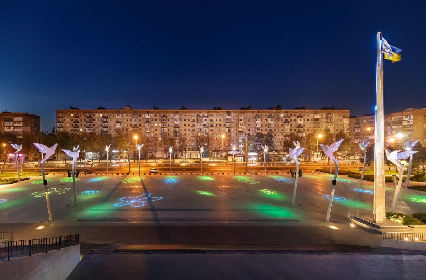Expolight створили динамічні світлові програми для всіх елементів площі: трибуни, флагштока, фонтану та дерев