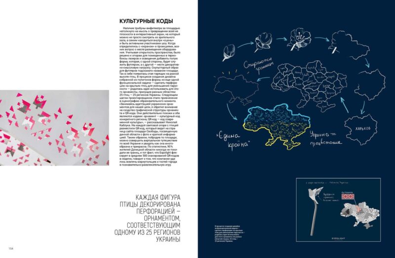 У процесі створення дизайну із функціонального завдання — зробити перфорацію на крилах птахів для зменшення вітрильності — народилася ідея використати для цього орнаменти з різних областей країни: 25 птахів — 25 регіонів України