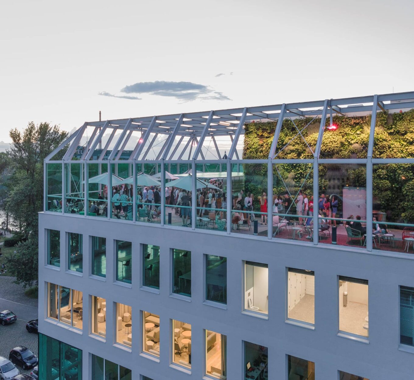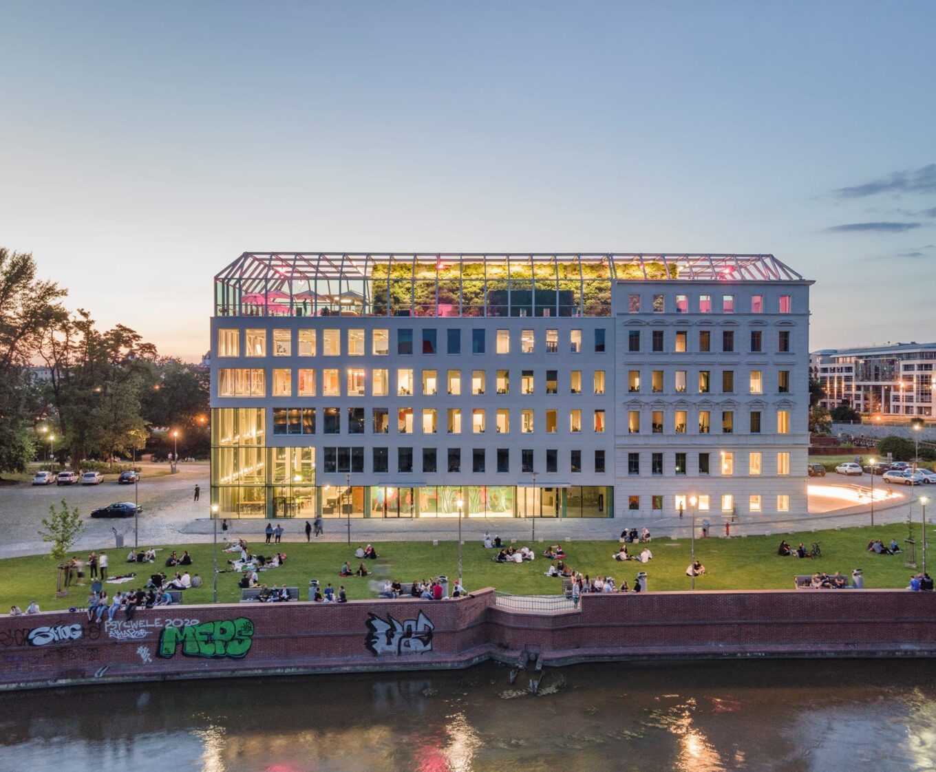Общая площадь здания – включая историческую часть и новое расширение – составляет 7 тысяч квадратных метров. Коворкинги и независимые офисы в целом рассчитаны на 400 рабочих мест, а общественные пространства – кафе и ресторан на крыше – открыты для всех желающих. Естественно, что принцип открытости исключал появление каких-либо ограждений вокруг объекта. Газоны вдоль Одера остаются местом отдыха горожан. Инвестиции в строительство составили более 10 миллионов евро.