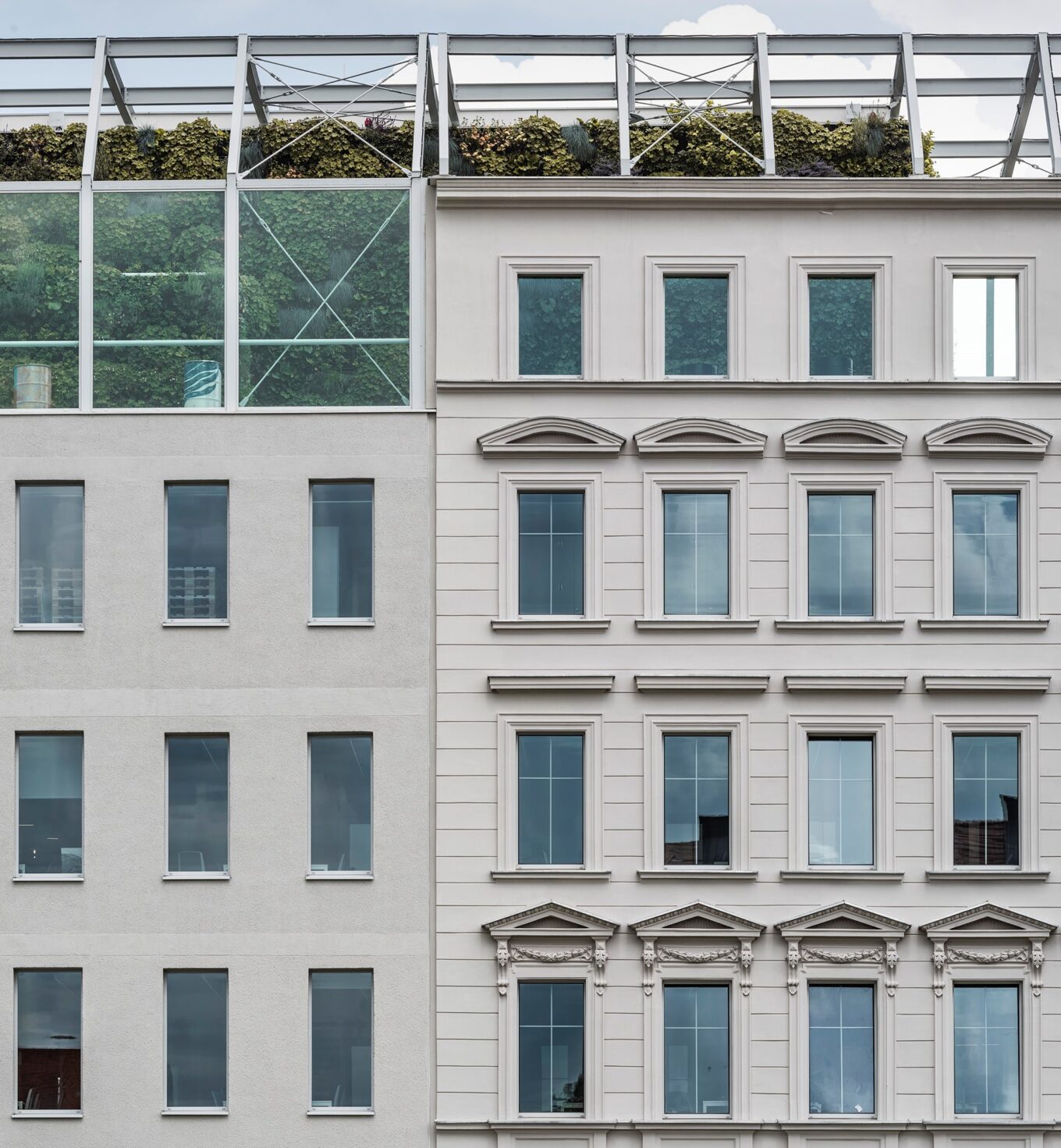 Новая структура не поглощает, а подчиняется архитектуре отреставрированного исторического фасада, сохранив высотность, ритм и размеры оконных проемов. Оранжерейная крыша объединяет обе части здания.