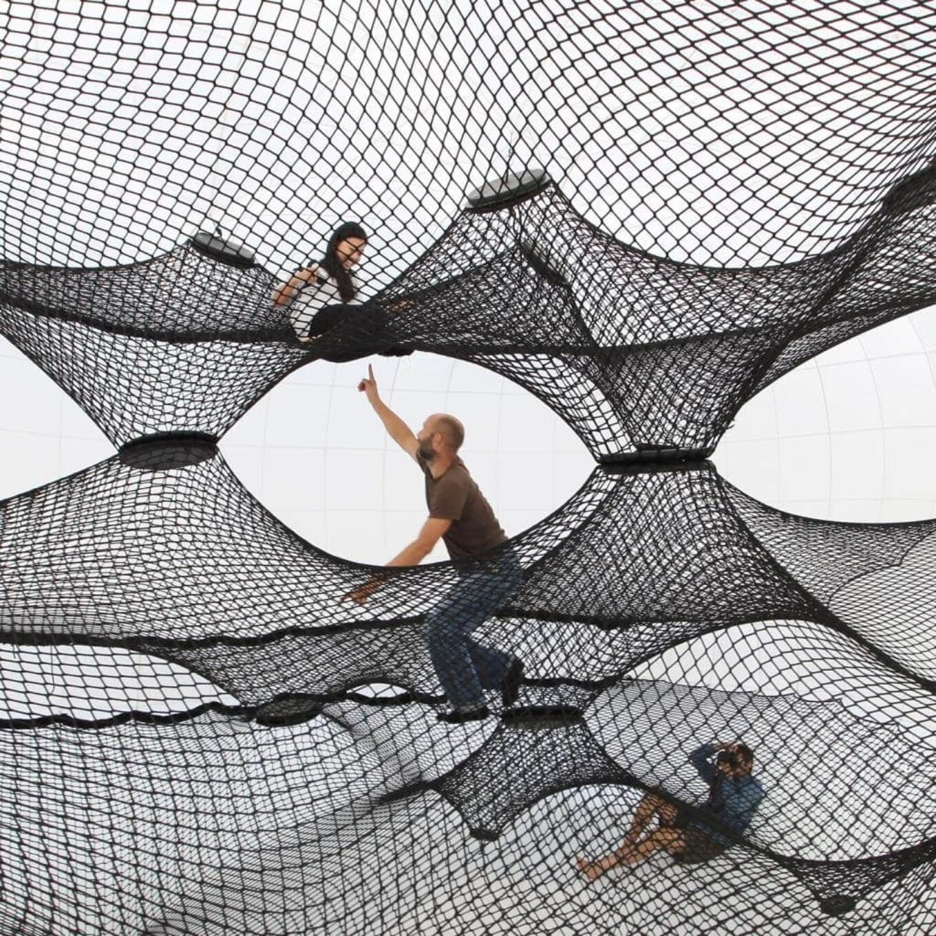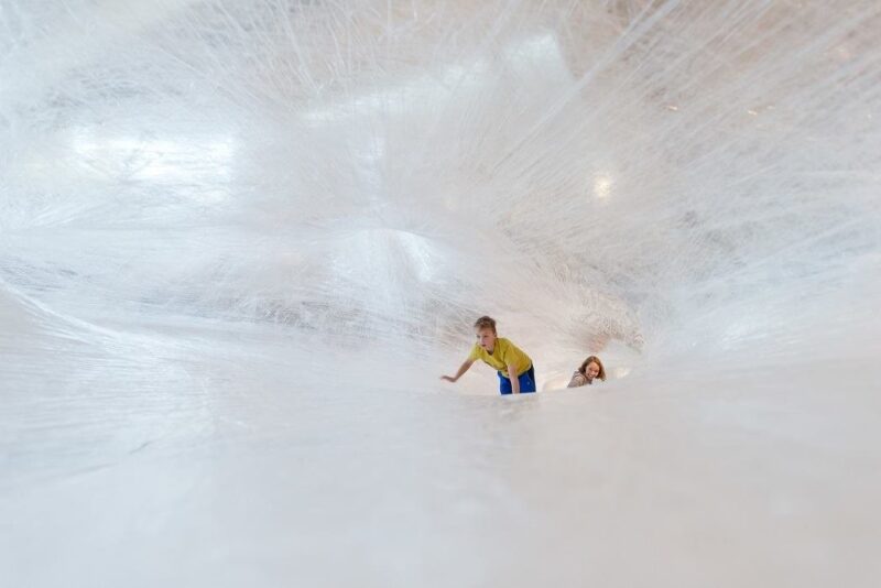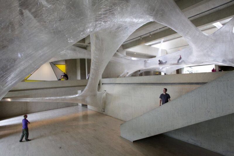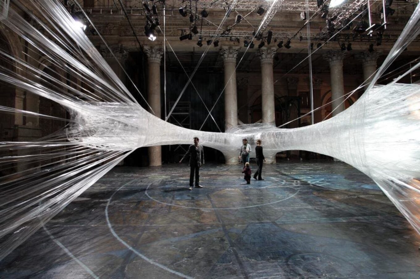 Это не первая пленочная инсталляция Numen, ранее художники плели свои паучьи гнезда в галереях Парижа, Вены и Франкфурта. В Вене – они растянули инсталляцию между колоннами театра Одеон, а в Париже – подвесили к потолку Музея современного искусства во дворце Токио.
