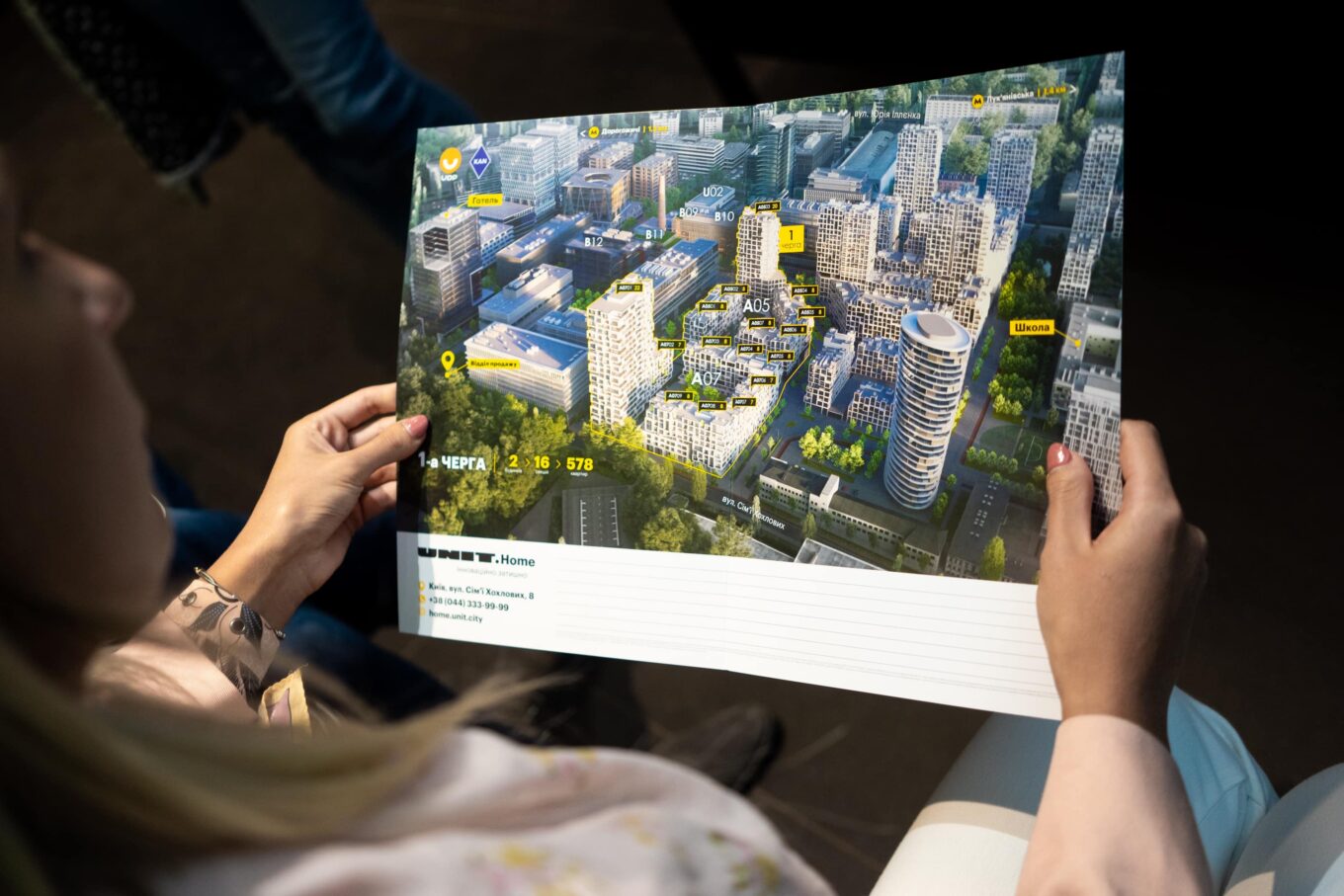 Проект UNIT.Home финансирует холдинговая компания UFuture Василия Хмельницкого. Соинвесторами и содевелоперами жилого квартала выступают компании UDP и KAN Development. Проект жилого квартала разрабатывала архитектурная компания archimatika. Фасады жилых домов решены в светлой гамме, которая удачно подчеркивает сложную выразительную пластику. Сами постройки имеют преимущественно невысокую этажность. Особенность проекта – огромные панорамные окна в пол в каждой квартире, которые создают эффект легкости и открытости.