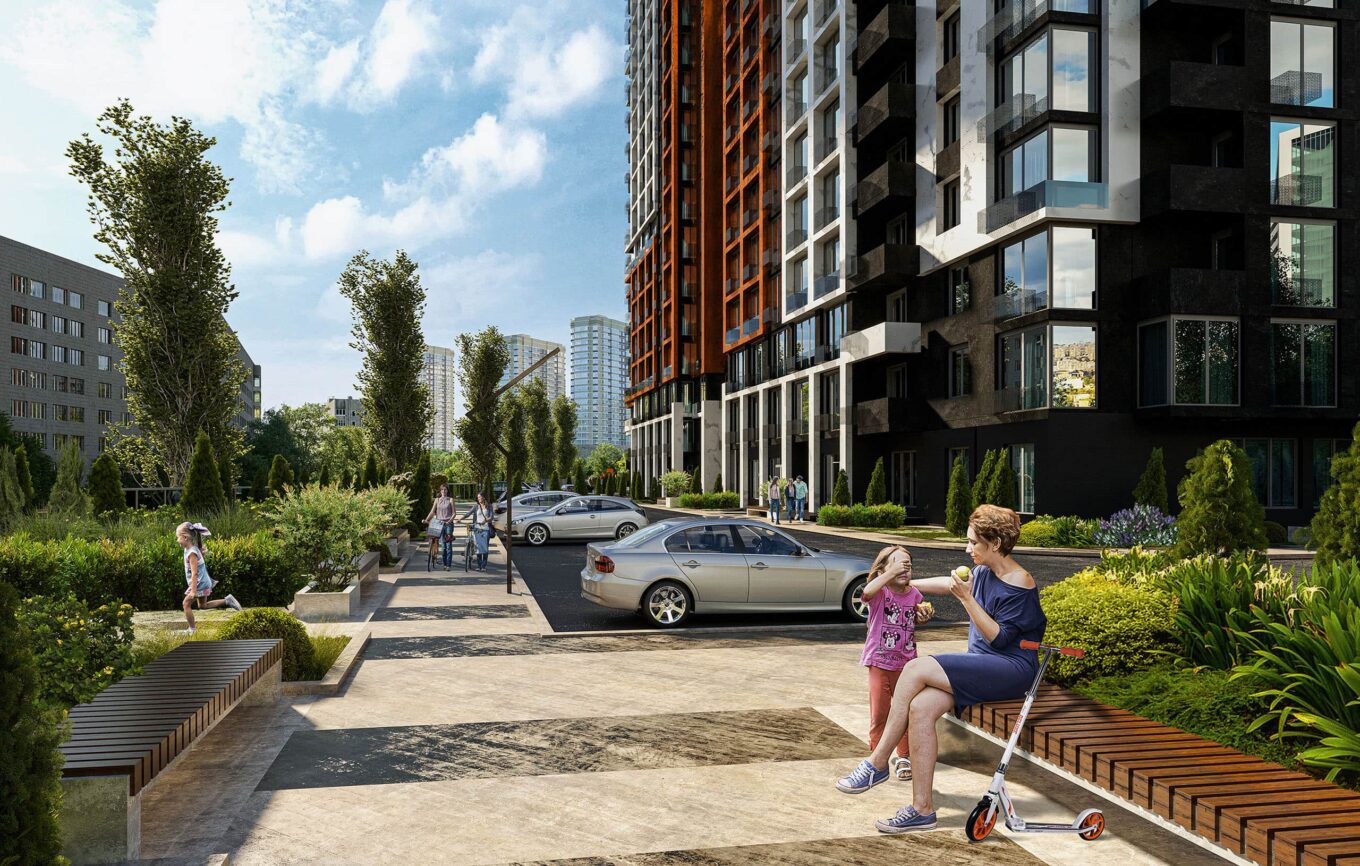 В INTERGAL CITY воплощена популярная тенденция двора без машин. Мы осознанно не предусматривали возможность парковки во дворе или возле выхода, поскольку на практике это все превращается в нагромождение автомобилей, невозможность проезда спецтранспорта, скорой помощи, пожарной и т. п. Поэтому предусмотрена следующая система: около входных групп будут зоны высадки пассажиров, но без возможности парковки. Ты можешь подъехать, высадить пассажира у входа или офиса и сразу уехать. Более того — здесь будут делинеаторы, чтобы машины только разворачивались и въезжали в определенные зоны паркинга, но не могли остановиться и создать затор.