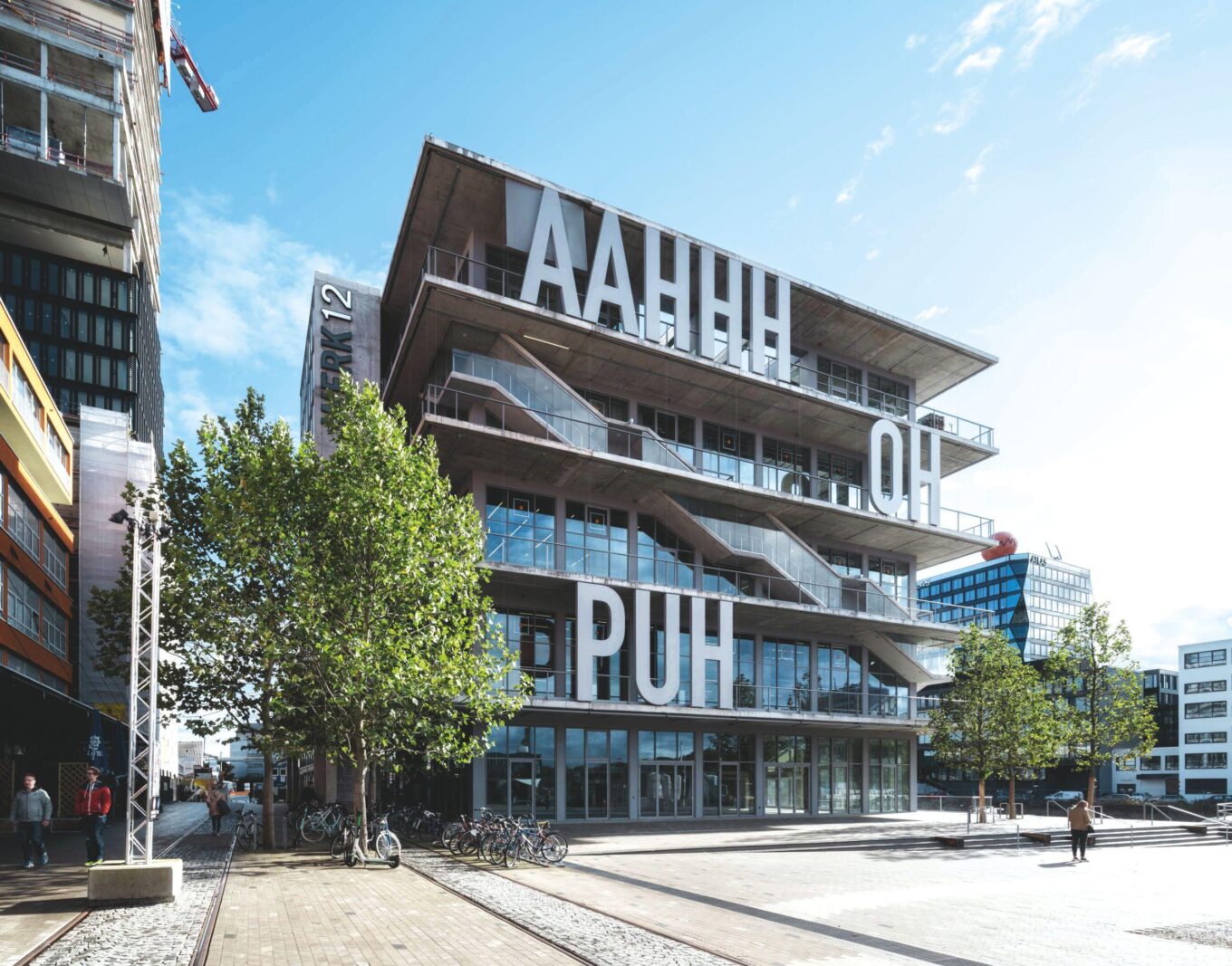 Спортивний центр Werk 12, спроєктований MVRDV Architects та N-V-O Architekten. Мюнхен, Німеччина. Фасад будівлі зі стрічковим склінням прикрашений фразами з популярних коміксів. Фото: Ossip Duivenbode33