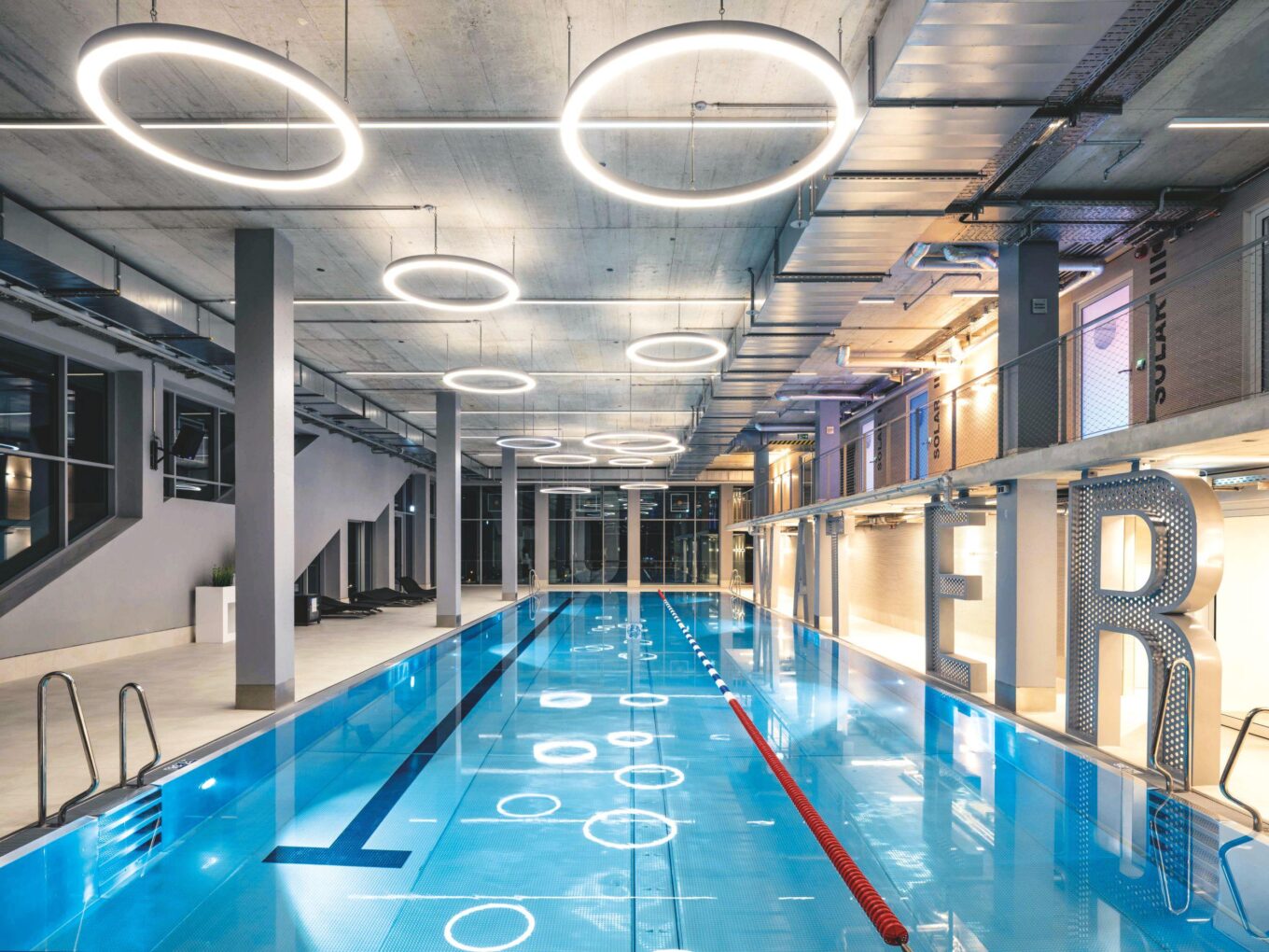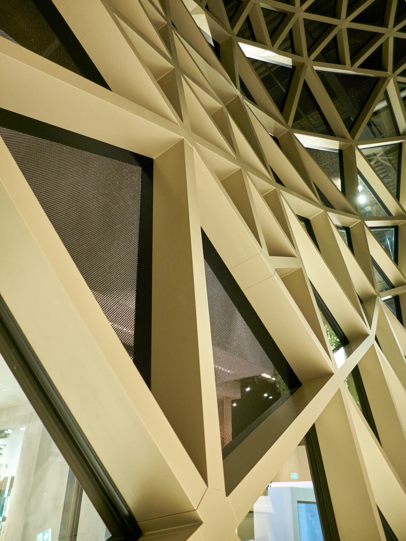Частину стелі будівлі займає фрагмент купольної самонесучої конструкції Schüco Grid2Shell, ця фасеткова структура дозволяє створювати футуристичні об’єми, подібні до тих, що проєктувала Заха Хадід і так любить Норман Фостер.