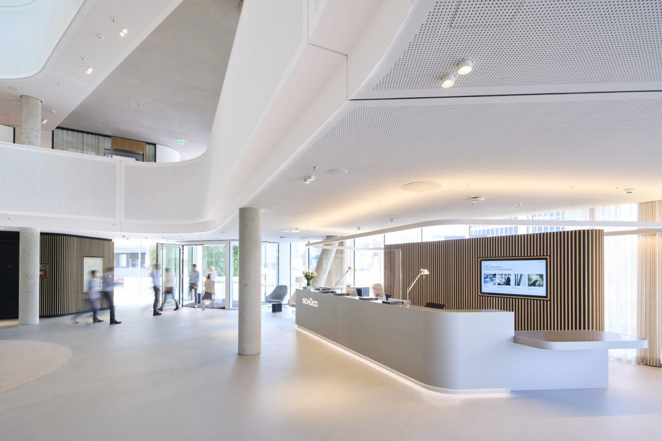 Відкриті робочі простори Schüco One виходять в атріум, де білі спіральні сходи піднімаються з центру фоє до верхнього рівня. Прозорий дах пропускає велику кількість сонячного світла, яке, тим не менш, не створює дискомфорт співробітникам.