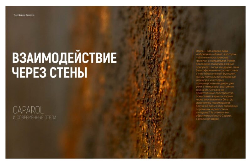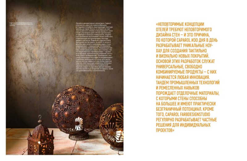 «Неповторимые концепции отелей требуют неповторимого дизайна стен — и это причина, по которой Caparol изо дня в день разрабатывает уникальные ноу-хау для создания тактильно и визуально новых покрытий. Основой этих разработок служат универсальные, свободно комбинируемые продукты — с них начинается любая инновация. Тандем промышленных технологий и ремесленных навыков порождает отделочные материалы, с которыми стены способны на большее и имеют практически безграничный потенциал. Кроме того, Caparol FarbDesignStudio регулярно разрабатывает частные решения для индивидуальных проектов».