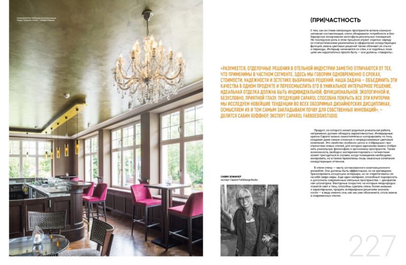 «Разумеется, отделочные решения в отельной индустрии заметно отличаются от тех, что применимы в частном сегменте. Здесь мы говорим одновременно о сроках, стоимости, надежности и эстетике выбранных решений. Наша задача — объединить эти качества в одном продукте и переосмыслить его в уникальное интерьерное решение. Идеальная отделка должна быть индивидуальной, функциональной, экологичной и, безусловно, приятной глазу. Продукция Caparol способна покрыть все эти критерии. Мы исследуем новейшие тенденции во всех обозримых дизайнерских дисциплинах, осмысляем их и тем самым закладываем почву для собственных инноваций», — делится Сабин Хоффнер, эксперт Caparol FarbDesignStudio.