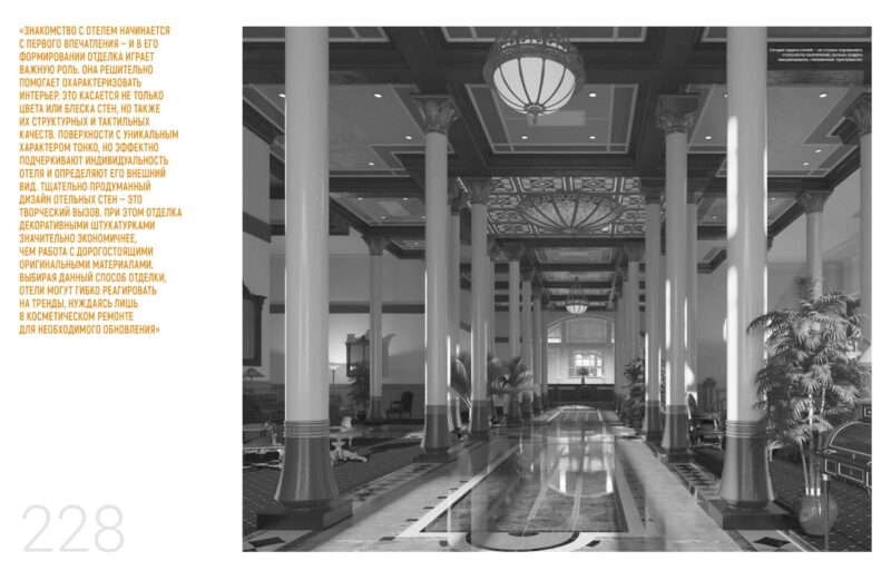 «Знакомство с отелем начинается с первого впечатления — и в его формировании отделка играет важную роль. Она решительно помогает охарактеризовать интерьер. Это касается не только цвета или блеска стен, но также их структурных и тактильных качеств. Поверхности с уникальным характером тонко, но эффектно подчеркивают индивидуальность отеля и определяют его внешний вид. Тщательно продуманный дизайн отельных стен — это творческий вызов. При этом отделка декоративными штукатурками значительно экономичнее, чем работа с дорогостоящими оригинальными материалами. Выбирая данный способ отделки, отели могут гибко реагировать на тренды, нуждаясь лишь в косметическом ремонте для необходимого обновления».