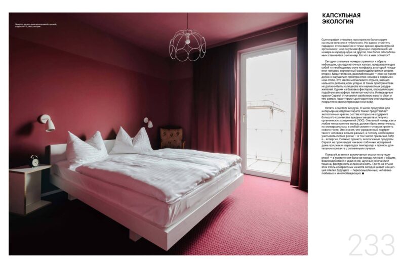 Кстати о чистоте воздуха. В числе продуктов для интерьерной отделки Caparol также представляет экологичные краски, состав которых не содержит большого количества вредных веществ и летучих органических соединений (ЛОС). Отельный номер, как и любое непостоянное жилье, должен быть эмпатичным, но универсальным, в любой момент готовым принять нового гостя. Это значит, что усредненный портрет такого человека весьма размыт, а потому необходимо учитывать любые риски — в том числе привычки, табу и… аллергии. Помимо прочего, экологичные продукты Caparol не производят никаких побочных испарений даже при резких перепадах температур и прямом длительном контакте с солнечными лучами.