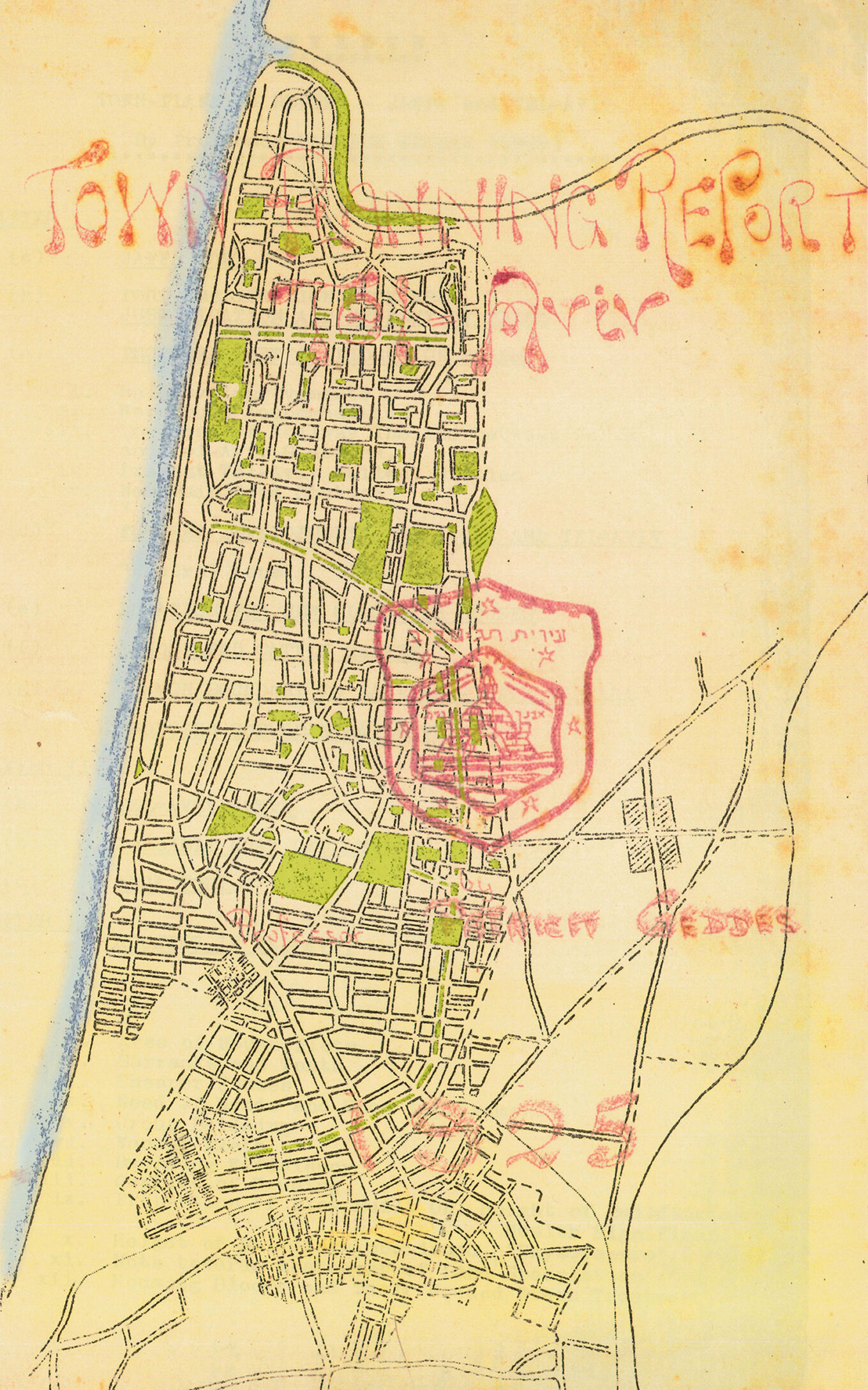 Роботу над генпланом Геддес розпочав у 1925 р. Його пропозиція на 62 сторінки пов’язувала поселення Ахузайт-Байт з іншими єврейськими районами й охоплювала територію всередині вулиць Мапу, Буграшов та Ібн Гвіроль, а також річку Яркон і узбережжя. «План Геддеса», що передбачав чотири типи вулиць, включаючи дві основні дороги, паралельні береговій лінії, був прийнятий у 1929 р. Поперечні вулиці він планував зробити торговими, а поздовжні перетворити на зелені бульвари чи житлові вулиці, при цьому всіма ними міська структура поєднувалася з морем. Між сіткою цих вулиць Геддес розмістив схожі за типологією міські блоки. В ідеальному варіанті вони являли собою квадрат зі сторонами в 200 м, затиснутий між чотирма головними вулицями, але їхня модифікація злегка змінювалася залежно від місцевості й інших умов.