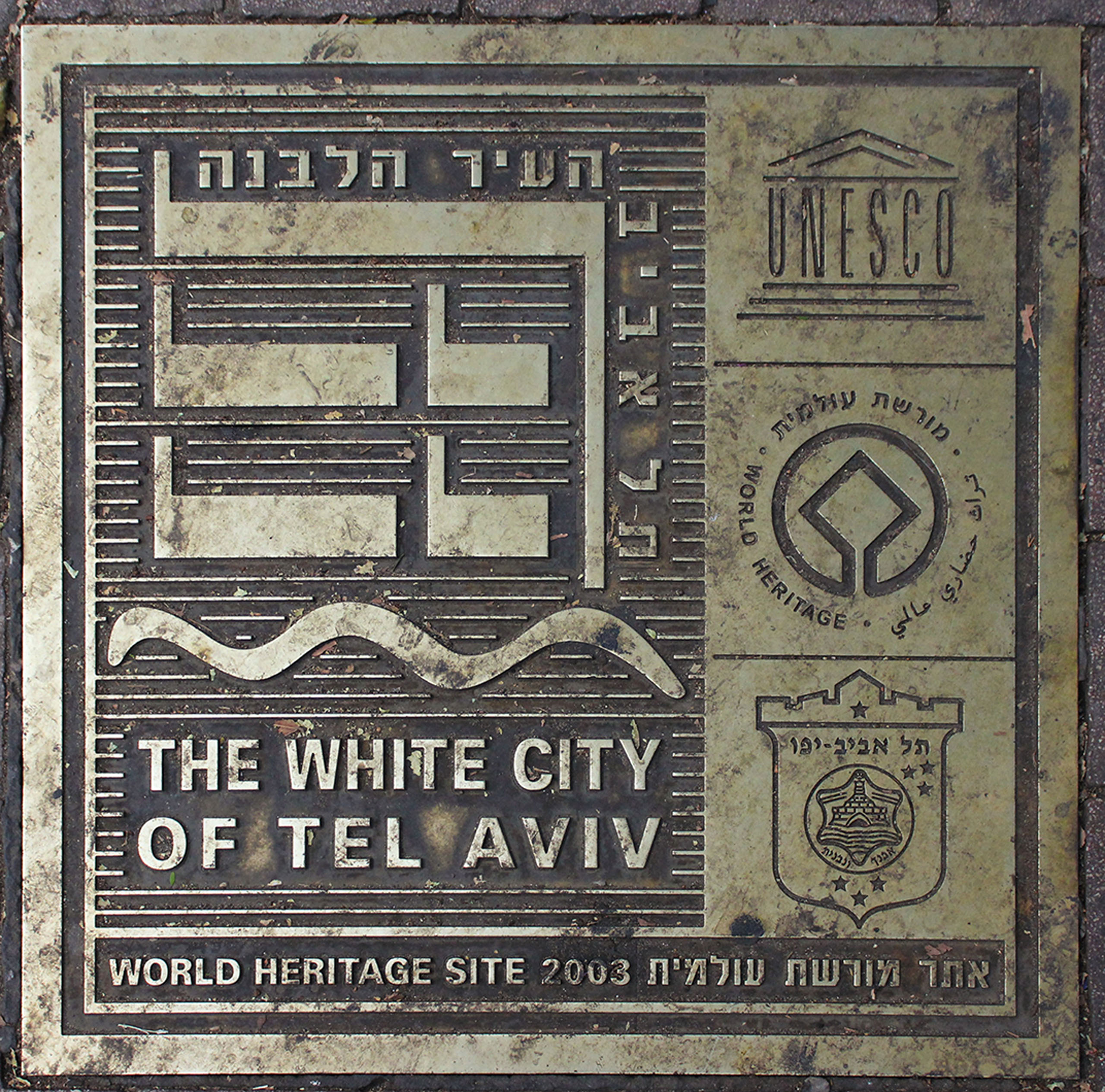 Бронзова плита на одній із бруківок Білого міста Тель-Авіва, встановлена у 2003 р. на честь його зарахування до списку об’єктів Світової спадщини ЮНЕСКО