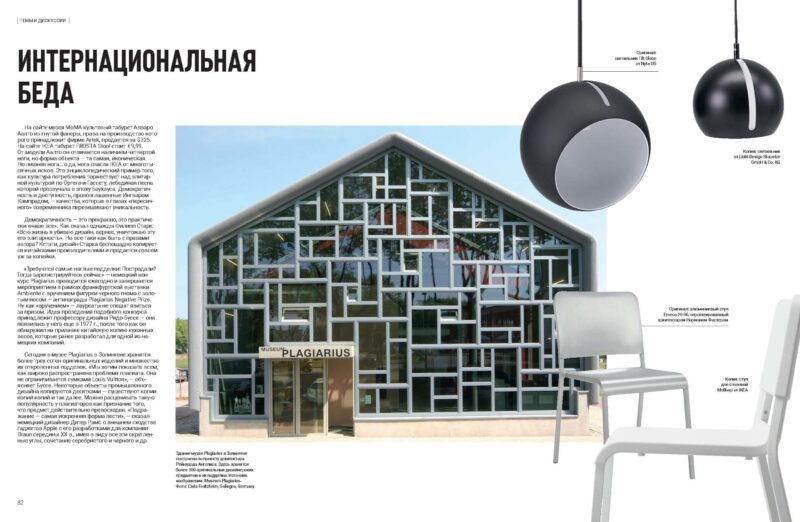 Неадекватна реакція показує, наскільки сирим є наше середовище. Виходить, що будь-який предметний дизайнер може одного разу отримати тавро плагіатора, і ніхто не розбиратиметься, чи це так. Достатньо однієї думки, щоб знецінити всі його заслуги. Але, якщо порівняти стільці знаменитих сучасних брендів зі стільцями не менш знаменитих модерністів, то з’ясується, що багато які з них схожі. Але схожі — це не знак рівняння до «плагіату».