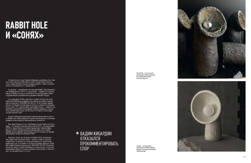 Зовнішня схожість «Соняха» та Rabbit Hole, на думку Вікторії, суто суб’єктивна: об’єкти мають різну геометрію. Відрізняються також матеріали й технології виробництва. На відміну від засновниці бренду FAINA Вікторії Якуші, яка дала PRAGMATIKA.MEDIA розгорнуте інтерв’ю, Вадим Кібардін, на жаль, відмовився прокоментувати суперечку та висловив побажання, щоб його публікація не цитувалася у статті.