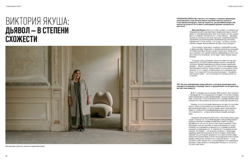 Мене лякає токсичність озвученої теми. Якщо звернутися до історії дизайну та мистецтва, то можна зіткнутися з мільйоном прикладів подібних суперечок. Конструктив — на користь української спільноти. Ми ще ростемо й болісно реагуємо на тригери, які у європейця не викликали б і найменшого пришвидшення пульсу. Але це не означає, що треба замовчувати тему. Я у своїх лекціях говорила про проблему плагіату на українському ринку, про те, що, наприклад, виробники меблів випускають відверті копії відомих світових брендів. Це, на жаль, масове явище на ринку. Він переповнений підробками. Але коли йшлося про сферу українського предметного дизайну, я ніколи не поспішала із заявами про плагіат.