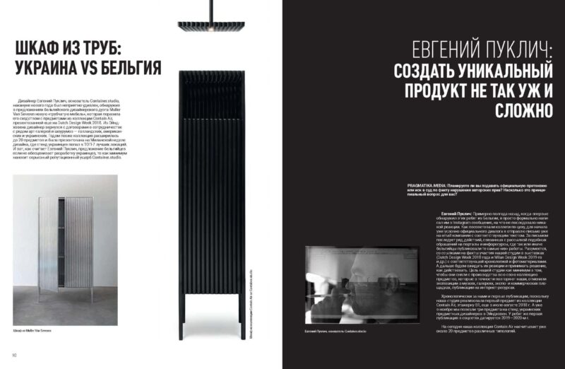 Дизайнер Євген Пукліч, засновник Container.studio, напередодні нового року був неприємно здивований, виявивши в пропозиціях бельгійського дизайнерського дуету Muller Van Severen нові «трубчасті меблі», які вразили його подібністю до предметів із колекції Contain Air, презентованої ще на Dutch Design Week 2018. Із Ейндховена дизайнер повернувся з договорами про співпрацю з низкою артгалерей і шоурумів — нідерландських, американських і українських.