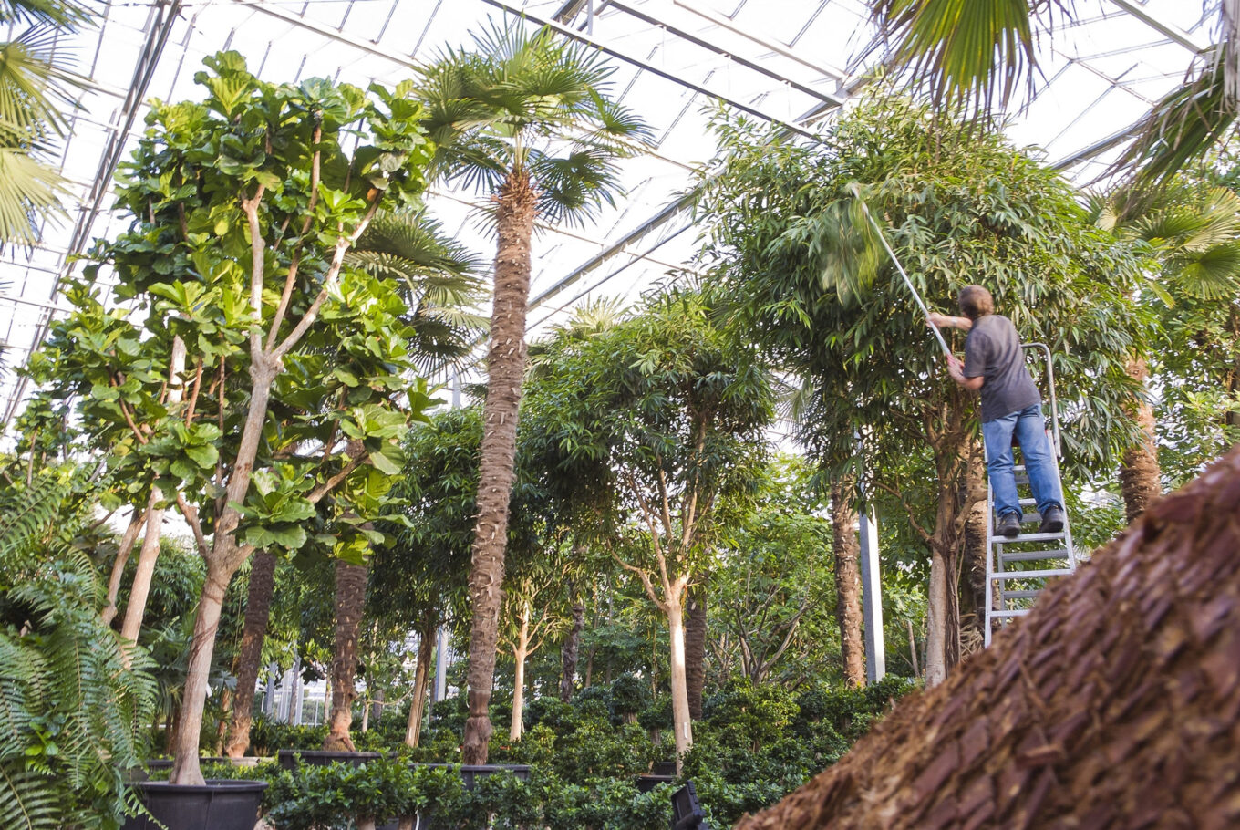 Крупные проектные растения для оранжерей — кокосовые, саговые, банановые пальмы, папайи, плюмерии, фикусы, мангровые деревья — голландцы закупают оптом в тропических и субтропических странах. Растения переезжают в морских контейнерах, сложенные штабелями, иногда даже без грунта. Когда груз доставлен в порт — их привозят в промышленные теплицы, климатроны, где высаживают в грунт в специальные контейнеры. Процесс укоренения и акклиматизации может длиться до двух лет — пока растения не окрепнут и не примут товарный вид. После этого их уже можно использовать для озеленения архитектурных объектов. Такие растения способны выдержать пересадку. Но еще какое‑то время после инсталляции на объекте экзоты должны находиться под наблюдением специалистов — до тех пор, пока не привыкнут к новым условиям, пока не сформируется единая биосистема.