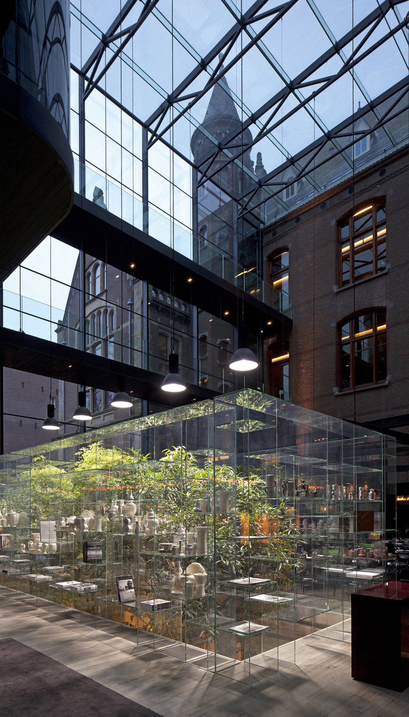 Посетив Conservatorium Hotel, над которым работал легендарный итальянский архитектор и дизайнер Пьеро Лиссони, мы увидим еще один подход к интерьерному озеленению. Превратив в атриум патио между историческими зданиями, Лиссони разместил в центре пространства небольшой сад, окружив его стеклянными витринами с авторской керамикой. Массивные стальные балки, подвешенные на цепях над оранжереей, подчеркивают хрупкость и изящество этой необычной инсталляции.