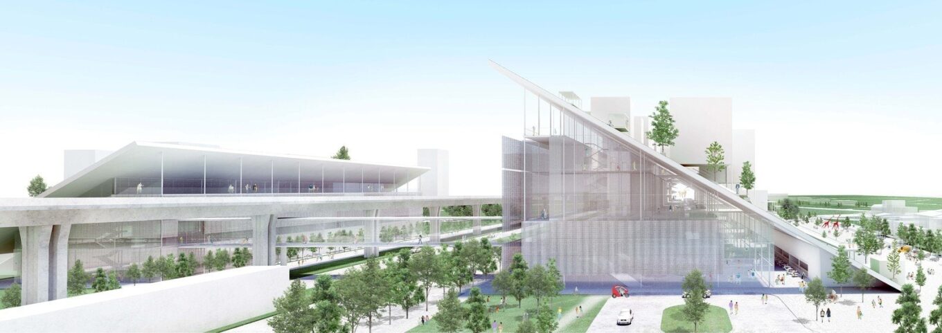 Китайский архитектор Рикэн Ямамото назвал свой проект Hill – «Холм» и представил новый музей в виде сложной структуры, объединенной двумя наклонными зелеными крышами, под и над которыми размещаются выставочные пространства, кафетерии, магазины. Объемы связаны между собой пешеходным переходом-галереей под железнодорожной эстакадой. Наклонные плоскости формируют сразу несколько смотровых площадок, амфитеатров для проведения театрализованных представлений и концертов под открытым небом. Один из склонов спускается к водоему и образует единое целое с набережной и зоной променада вокруг пруда.