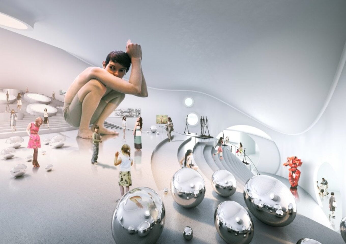 Визуализации позволяют нам увидеть, какими в MVRDV представляли интерьеры музея – архитекторы предлагали разделить пространства на тематические «комнаты», наделенные разными функциям, например – «зеленые комнаты», «джунгли», «дом реки».