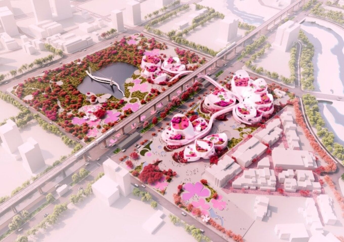 Тема цветка-бабочки многократно обыгрывается в формах клумб, отдельно стоящих павильонов и водоемов, которые связаны между собой извилистыми дорожками и воздушными мостиками. Архитекторы стремились к созданию яркой идентичности и сделали упор на цветовое оформление, выбрав для алюминиевых фасадов, цветочных клумб и декоративного мощения несколько оттенков розового – от нежно-вишневого до интенсивных фуксии и розовой лаванды.