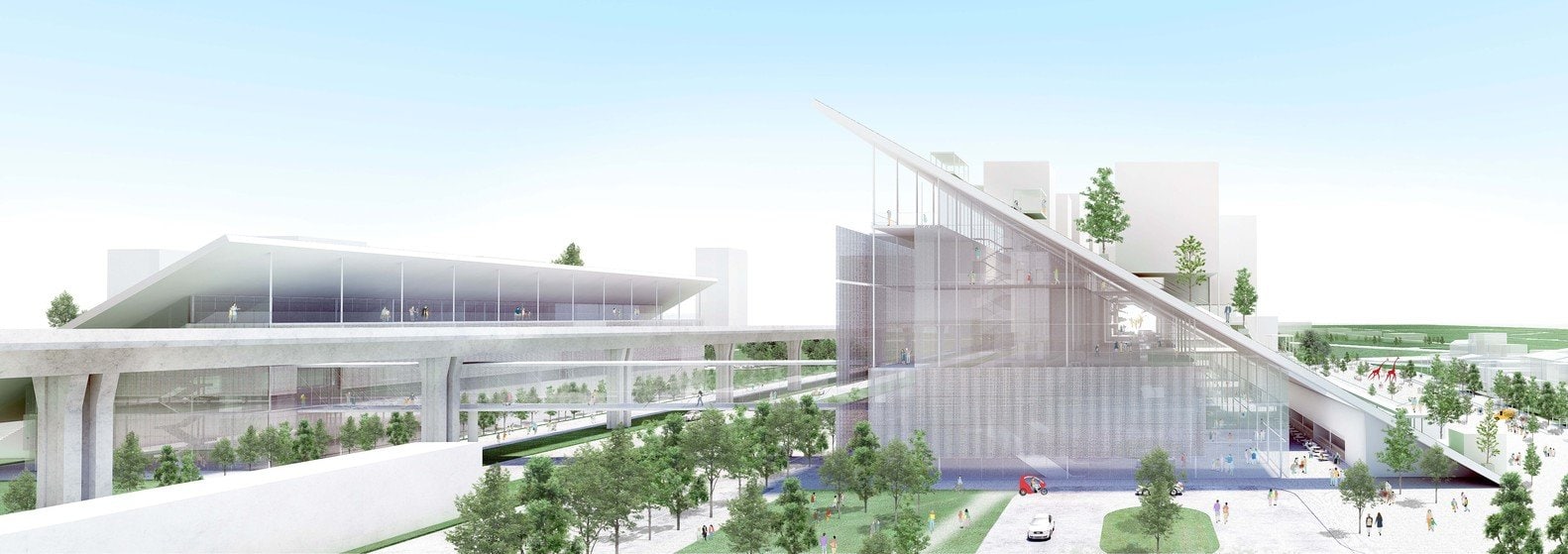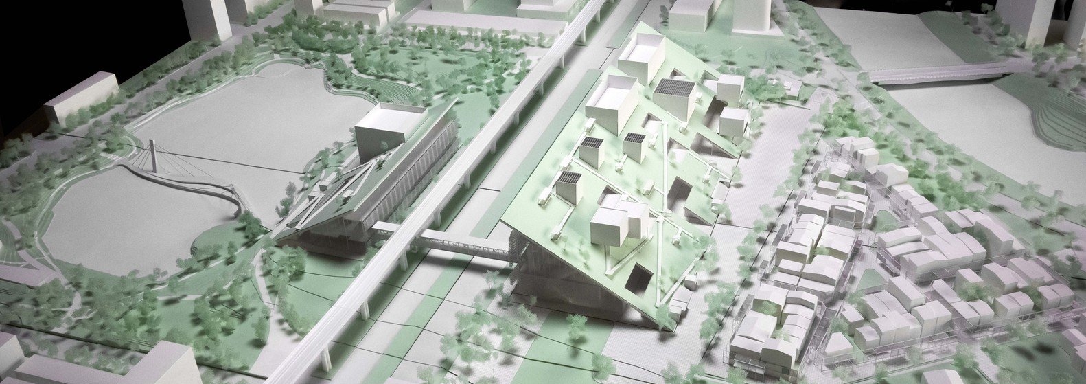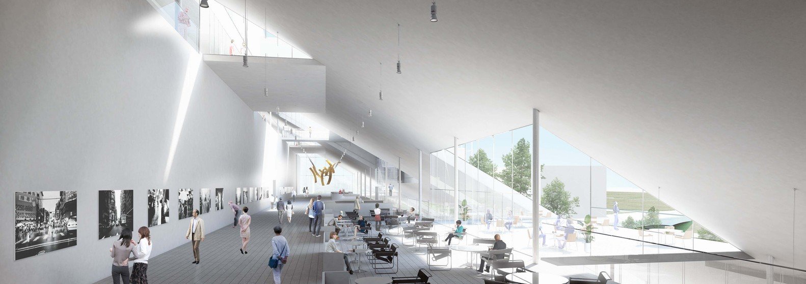 Китайский архитектор Рикэн Ямамото назвал свой проект Hill – «Холм» и представил новый музей в виде сложной структуры, объединенной двумя наклонными зелеными крышами, под и над которыми размещаются выставочные пространства, кафетерии, магазины. Объемы связаны между собой пешеходным переходом-галереей под железнодорожной эстакадой. Наклонные плоскости формируют сразу несколько смотровых площадок, амфитеатров для проведения театрализованных представлений и концертов под открытым небом. Один из склонов спускается к водоему и образует единое целое с набережной и зоной променада вокруг пруда.