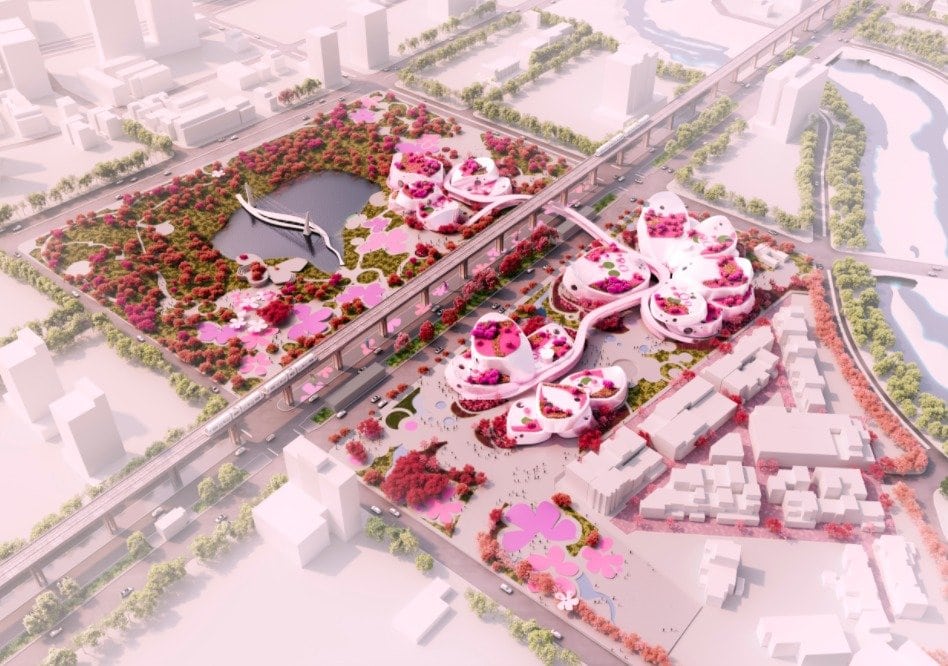 «Лепестковые объемы зданий накладываются друг на друга, создают переходы и выступы с глубокой тенью. Цветочные фигуры повторяются в парке и формируют его единый образ», – сообщили в MVDRV.