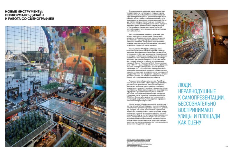 Розширюється і набір інструментів. Про UX-дизайн ми вже згадували, а ось нідерландська дослідницька організація Platform-Scenography пропонує виділити сценографію в окремий напрям міського дизайну та міждисциплінарну практику. Свого часу художники-авангардисти та футуристи зробили революцію на театральній сцені, створюючи багатоваріантні декорації за допомогою світла, символів, універсальних форм. У Platform-Scenography пропонують використовувати щось подібне для того, щоб зробити міські пабліки різноманітнішими.