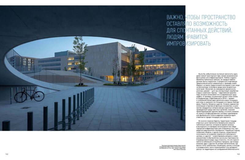 Було б надмірним намагатися заповнити один, навіть найпросторіший парк, усіма можливими функціями чи інфраструктурою. Будь-який стадіон є публічним місцем, не кожен паблік має бути стадіоном. Із віком спортивні вподобання можуть змінитися, наприклад, скейтбординг залишається прерогативою молоді, а ось їзда на велосипеді популярна серед усіх вікових категорій. Незважаючи на позірну архаїчність вуличних шахів, — для нас вони є атрибутом старих радянських парків — європейські архітектори активно вписують їх у сучасні ландшафти.