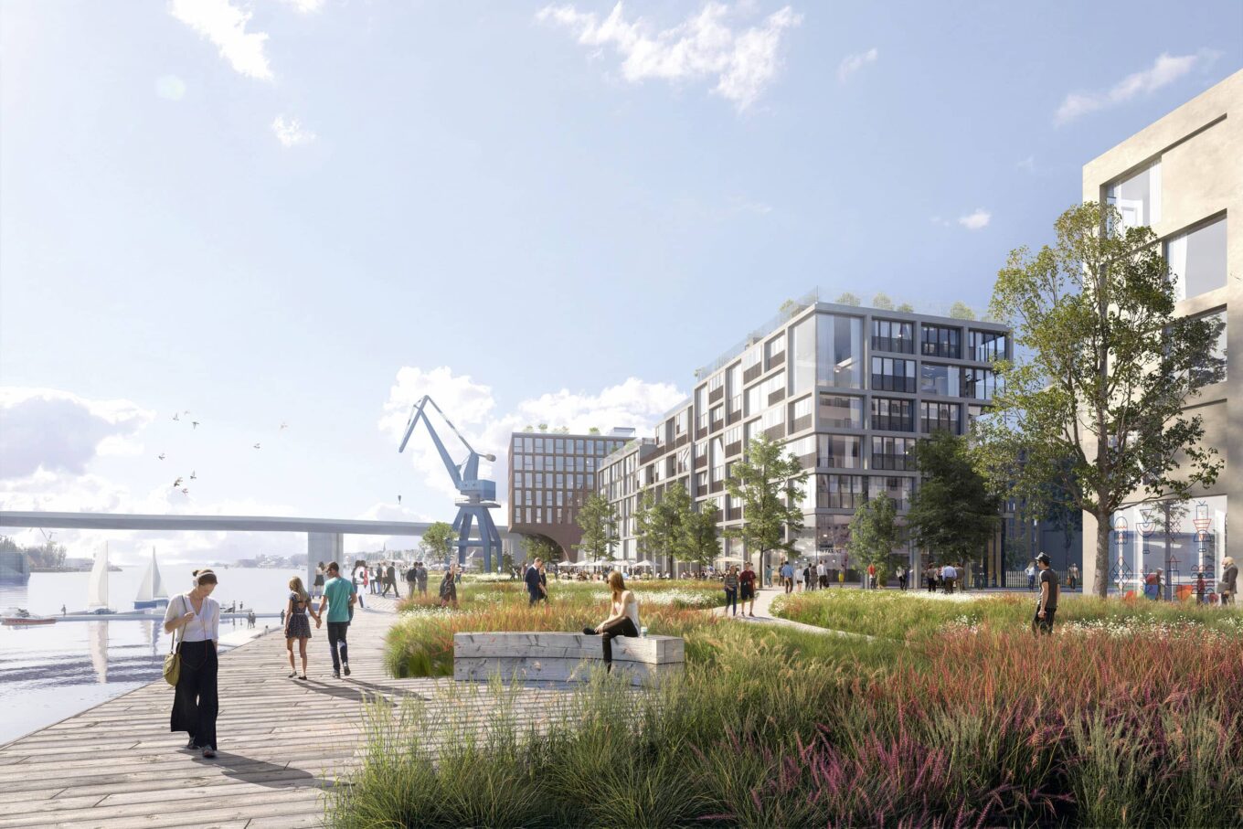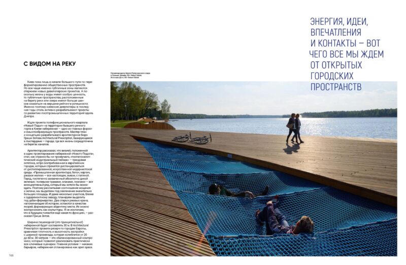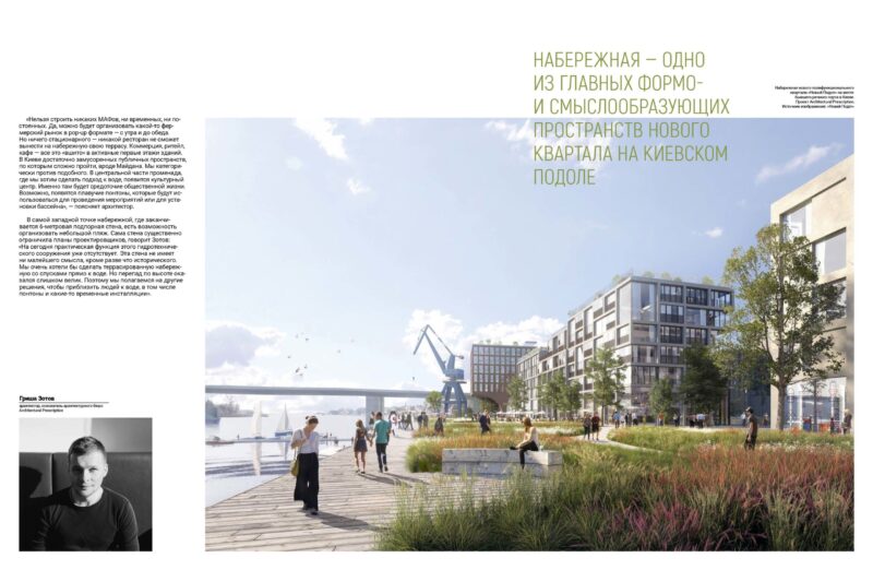 І для проєкту поліфункціонального кварталу «Новий Поділ» на території колишнього річкового порту в Києві набережна — один із головних формо- та смислотворчих просторів. Майстер-план і концепцію розробляло архітектурне бюро Гриші Зотова Architectural Prescription, що базується в Амстердамі — місті, де все життя зосереджене на берегах каналів.