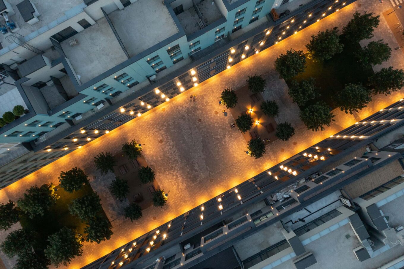 Внутрішні двори ЖК RYBALSKY — приватно-громадська територія, доступна резидентам комплексу. Джерело зображення: RYBALSKY
