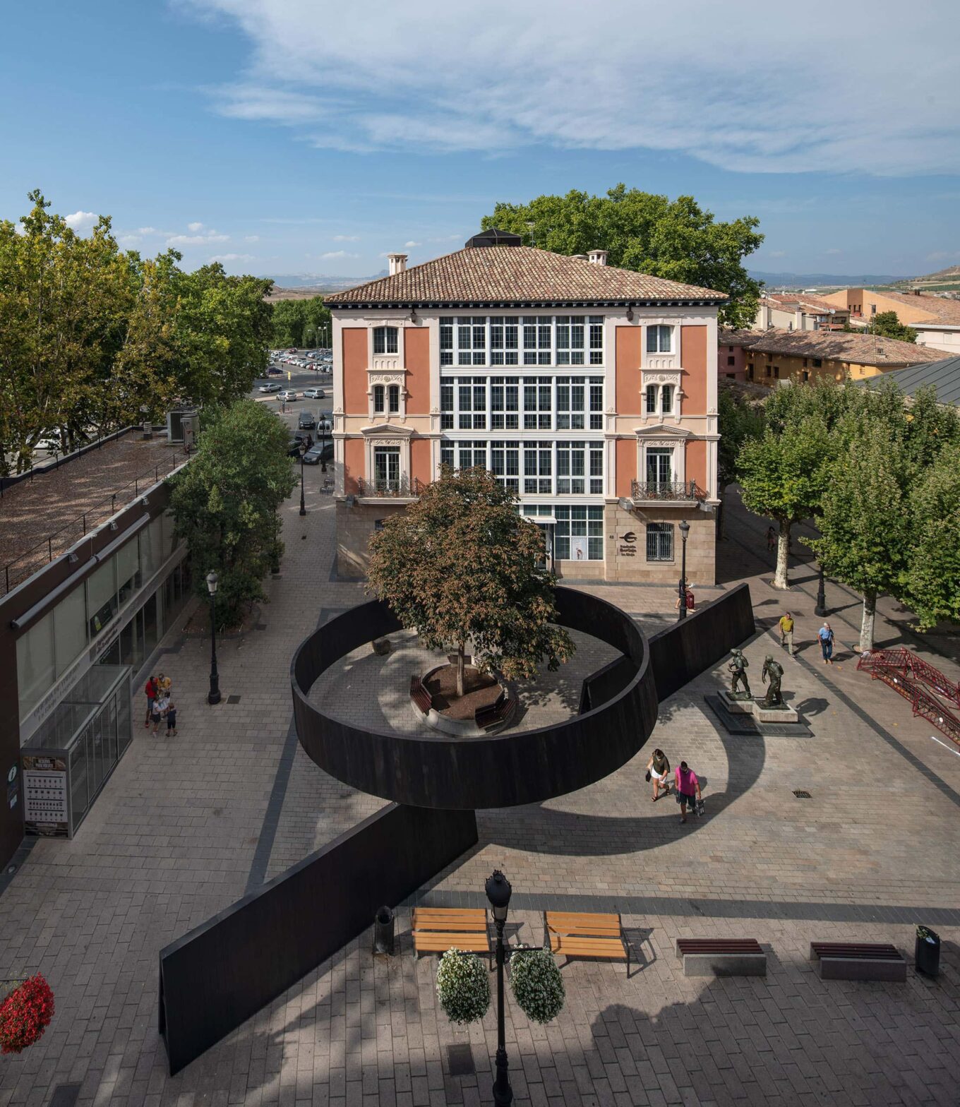Архітектуру малих форм — павільйони, інсталяції — можна використовувати не тільки як самодостатні елементи, але і як сполучну ланку для розрізнених функцій і об’єктів. Наприклад, у рамках вересневого урбан-фестивалю Concéntrico у центрі іспанського міста Логроньйо з’явився оригінальний павільйон від студій sauermartins + Mauricio Méndez. Він розташований на міській площі, «населеній» різноманітними елементами — кілька видів міських меблів, статуї, старе дерево. Новий павільйон упорядковує цей візуальний хаос. Усього дві лінії — діагональ і коло — зв’язують усі розрізнені елементи докупи і створюють цілісний орієнтир, значно змінюючи сприйняття місця. Люди з більшою ймовірністю запам’ятають (внесуть до своїх когнітивних карт) цю площу завдяки павільйону.