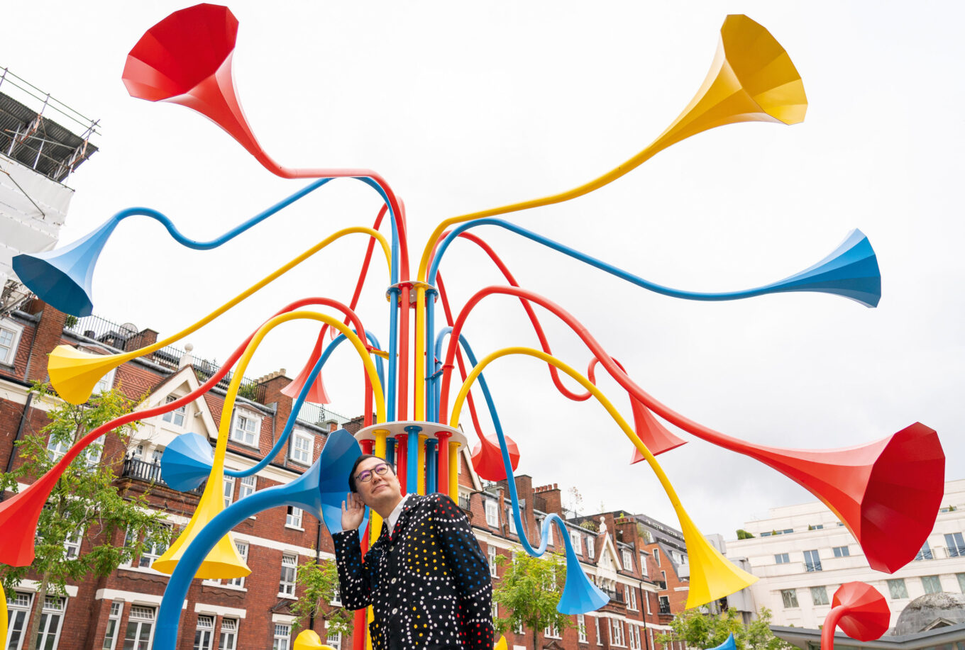 Художник Юрій Сузукі демонструє, як можна взаємодіяти з його інсталяцією Sonic Bloom, яка встановлена в районі Мейфейр у Лондоні. Джерело фото: thetimes.co.uk