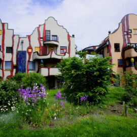 Живыми Хундертвассер делает и свои дома. Дома без прямых линий, в которых архитектура подчинена естественному ландшафту, дома с крышами, покрытыми травой и интерьерами, в которых главными «квартиросъемщиками» являются деревья, дома, похожие на лесистые холмы и зеленые пастбища. Дома, в которых нет ровных полов, но есть дюны и барханы. «Человек и природа должны жить в гармонии», – говорил Хундертвассер, предлагая совершенно головоломную геометрию в своих неравномерно окрашенных и оштукатуренных жилых пространствах, призванных вырвать обитателя из серости и обыденности и отучить общество от линейного мышления. Так, в знаменитой «Лесной спирали» в Дармштадте нет ни одного прямого угла, и из тысячи окон на фасаде жилого комплекса ни одно не повторяет другое.